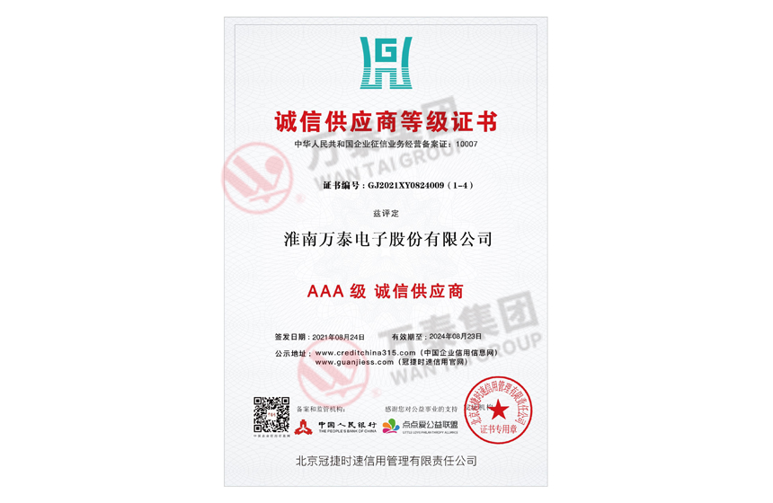 • 诚信供应商等级证书