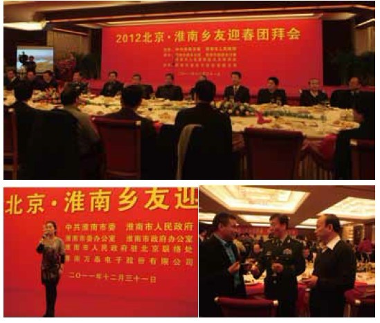 2011年12月30日,由中共淮南市委、市政府、 淮南市人民政府驻北京联络处主办,8868体育官网登录协办的2012北京•淮南乡友迎春团拜会在首都北京中国职工之家酒店隆重召开,由中共淮南市委书记杨振超主持,市长曹勇致辞,邀请了原武警总部副司令、中将陈传阔,中国社会科学院副院长李杨,国务院参事室党组成员副主任王为民等乡友代表做精彩发言。