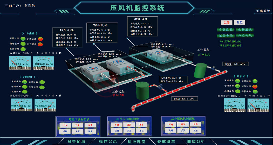 7)模拟动画实时仿真监控压风机房的内/外部运行状态,有图表、曲线等多种显示压风机的运行参数和运行趋势。