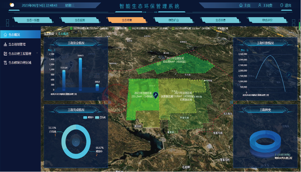14.综合评价:实现环保-生态数据融合,在综合分析大屏上整体展现当前矿区的环保效益,展现出当前矿区生态监测的“空天地”一体化信息、生态修复的规划、实施及阶段性 “减排、增益”目标成果等内容。