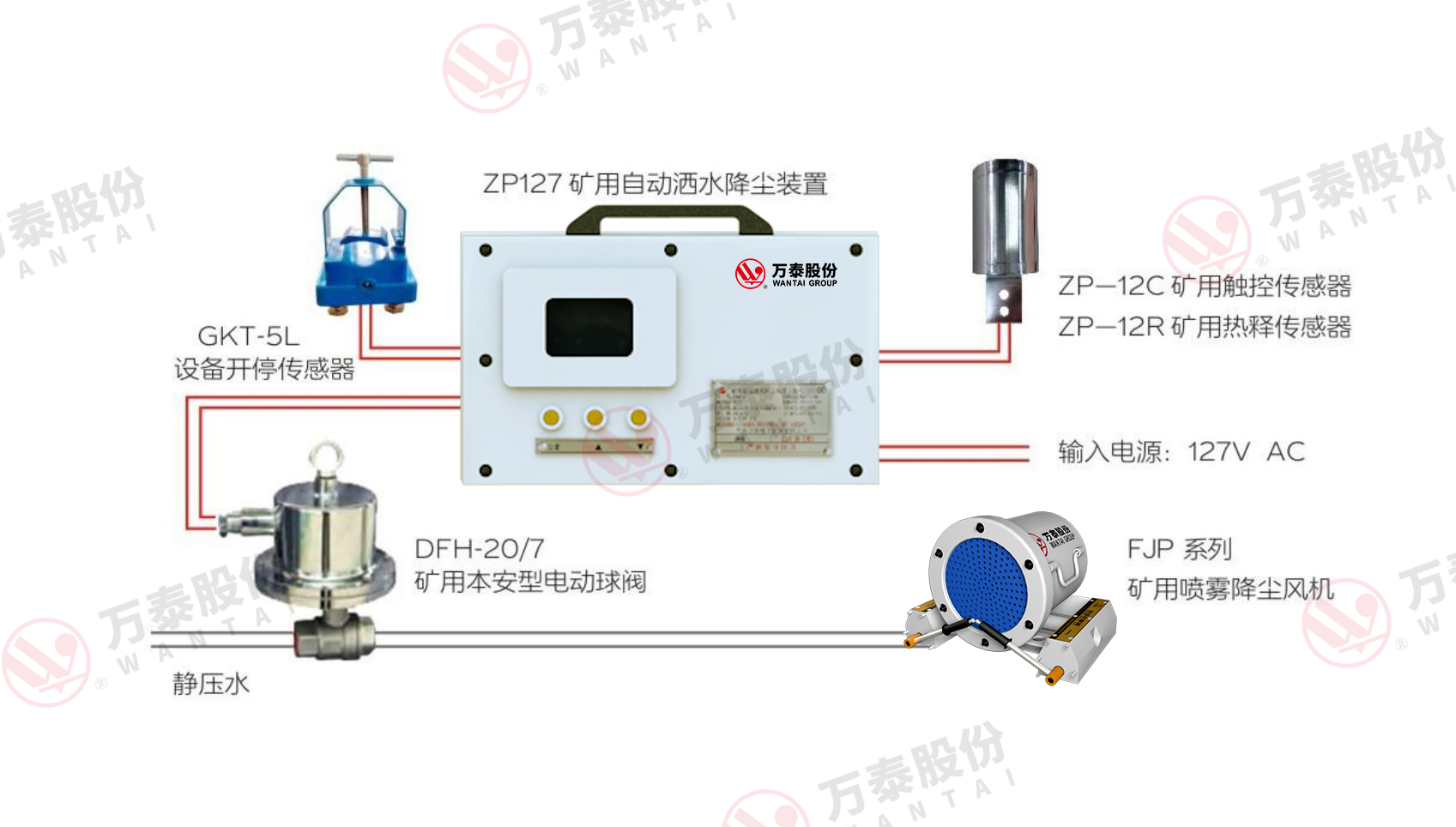 矿用水动力自动降尘系统主要由水动力降尘器、自动洒水降尘装置主控箱、触控传感器、热释传感器、设备开停传感器等设备组成。